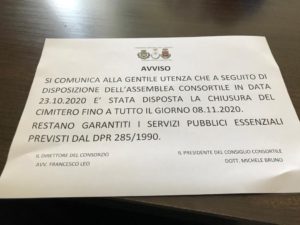 Chiuso il Cimitero di Casoria Maria Floriana Alaia 29 Ottobre 2020 Visualizzazioni: 338 Si comunica che è stata disposta la chiusura del Cimitero di Casoria fino all’8 Novembre 2020. Restano garantiti i servizi pubblici essenziali previsti dal DPR 285/1990.