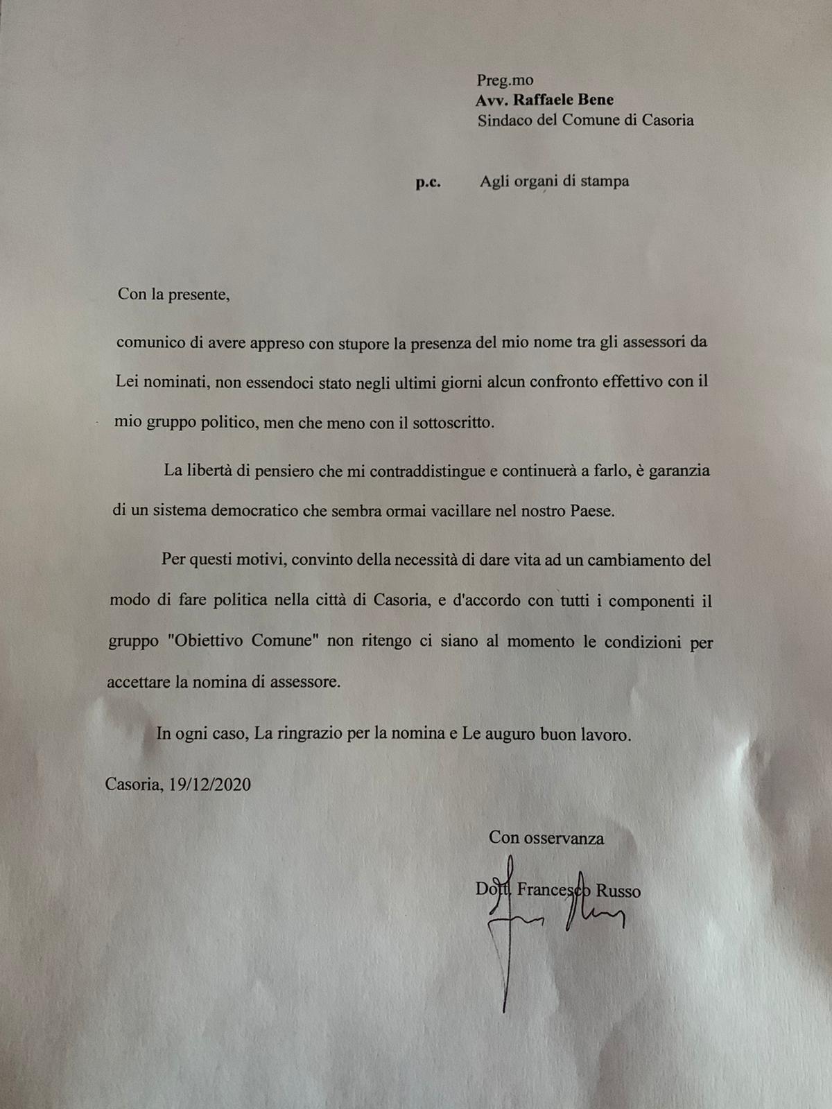 Neanche il tempo di comunicare la nuova Giunta che c’è già la prima defezione, situazione che mette tutto in discussione nelle scelte del sindaco Bene. L’ex assessore all’Ambiente Francesco Russo, che nella nuova composizione della giunta avrebbe avuto la delega ai lavori pubblici, ha inviato una lettera al sindaco comunicando in via ufficiale che non ci sono le condizioni per accettare l’incarico visto lo scarso confronto avuto sia con il diretto interessato che con il gruppo politico “Obiettivo Comune”. Ecco la lettera: