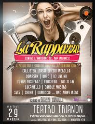 con le strade semideserte adatte a sfidarsi in gare di break dance, perché il mondo del rap è anche questo la danza, il colore, la sfida. Dal 2000 ad oggi il rap napoletano rappresenta una realtà viva nelle rime di Ciccio Merolla, dei Co’ sang, Callister, Fuossera, Lucariello, Shona, Svez, Uomodisu, i Fuossera, dj Uncino, Dope, che sono solo alcuni dei nomi che saliranno sul palco del Trianon: sarà una grande festa, per sostenere le nuove parole che sono già nella musica napoletana». Un’inedita jam session che non dimenticherà Raffaele Viviani, primo rapper napoletano ante litteram, del quale verrà proposta ‘A rumba degli scugnizzi nel gran finale.