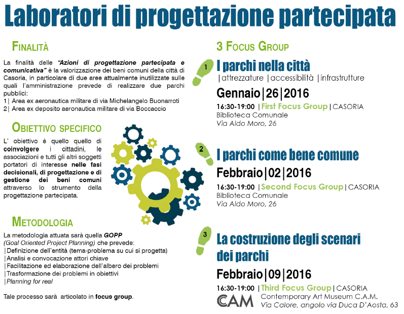 Terzo Focus Group Urbact III flamacom 6 Febbraio 2016 Visualizzazioni: 308 Martedì 9 febbraio 2016 si terrà al museo CAM di Casoria dalle 16.30 alle 19.00 il terzo incontro del progetto europeo Urbact III denominato “La costruzione degli scenari dei parchi.”